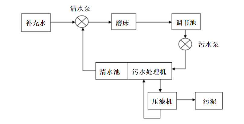 磨削工段的磨床在工作之時一般需要水作為冷卻劑,排出的冷卻水中含有磨料粉末及加工件的微小懸浮顆粒,冷卻水不經(jīng)處理直接排放的話會堵塞管道、污染環(huán)境。