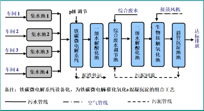 各類(lèi)生產(chǎn)線(xiàn)的廢水進(jìn)行單獨(dú)收集,之后統(tǒng)一送入初調(diào)節(jié)池中進(jìn)行水質(zhì)的調(diào)節(jié);預(yù)處理采用“鐵碳微電解+催化氧化+混凝沉淀”工藝,沉淀溢流到一級(jí)水解酸化池中,之后流入到綜合調(diào)節(jié)池中,與生活污水、清潔下水混合后,送入二級(jí)水解酸化池,水解后出水至生物接觸氧化池中進(jìn)行好氧處理,處理后水進(jìn)入沉淀池中,上清液排放。