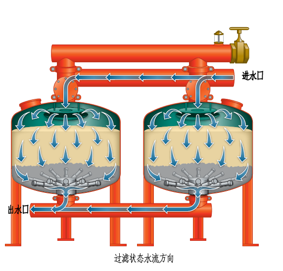 當系統(tǒng)處于過濾狀態(tài)時,未經(jīng)過濾的水通過布水器均勻布水,水以層流狀態(tài)通過過濾器內(nèi)的填料層(精制均粒石英砂、石榴石)。當水經(jīng)過填料層時,雜質(zhì)被截留在填料層內(nèi)。過濾器底部有多個均勻分布的集水器,將過濾后的水均勻地收集并引出,平流過濾,可以使過濾器在高流速下過濾,仍可達到較好過濾的效果。