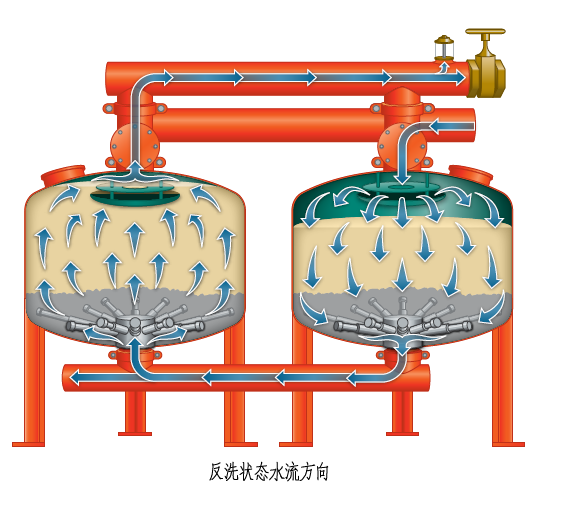 當系統(tǒng)處于反洗狀態(tài)時,過濾仍然繼續(xù)。過濾后的清潔水部分用來反洗標準單元砂缸,其余仍送到用戶處。反沖洗污水則通過水力閥的反洗排水口被排出。在高速砂缸全自動高效過濾系統(tǒng)中,特殊的集水器設計可使填料之間填料相互搓洗,最大限度地提高反沖洗效率,減少所需的反洗水(清潔水),同時反洗時沒有跑料現(xiàn)象。一個標準單元砂缸反洗為2分鐘,反沖洗結(jié)束,標準單元砂缸內(nèi)部壓頭損失減小到合理范圍,定壓裝置給出復原信號,水力閥恢復到過濾狀態(tài),下一個標準單元砂缸則準備進入反洗狀態(tài)。