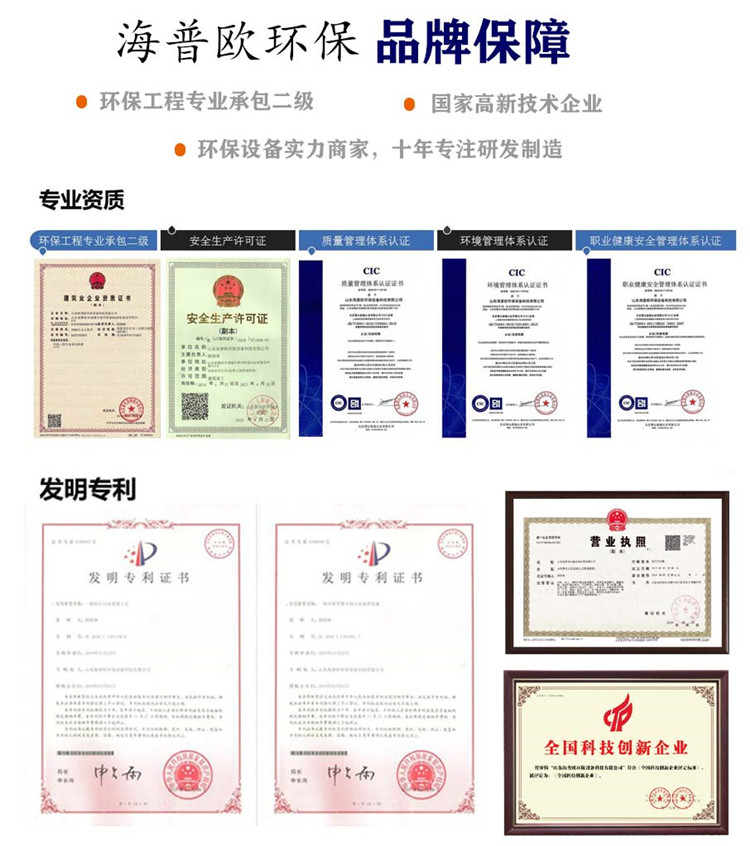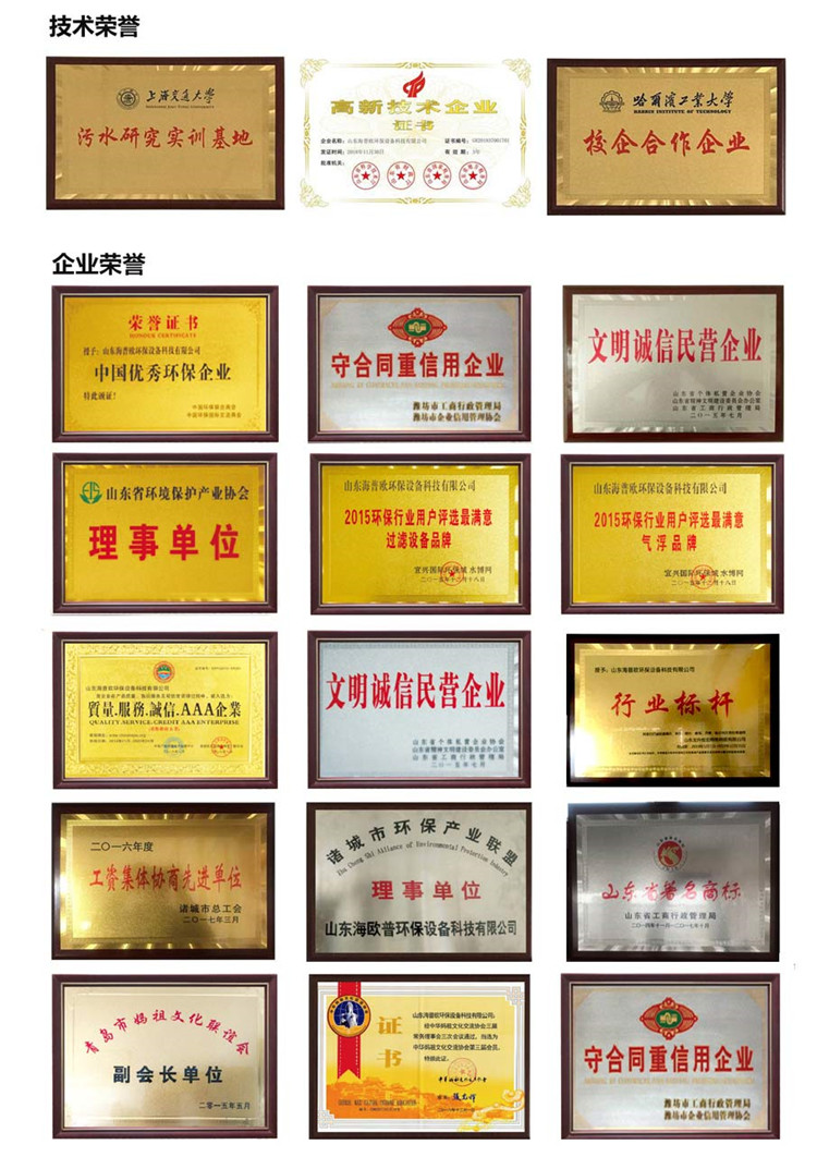 今年6月27日,我國的水污染防治法再次修訂,新修訂的水污染防治法更加明確了各級政府的水環(huán)境質(zhì)量責任,實施總量控制制度和排污許可制度。針對國家的政策,海普歐重新審核申請通過了 環(huán)保工程專業(yè)承包貳級資質(zhì)、安全生產(chǎn)許可證;并通過了ISO9001質(zhì)量體系認證、ISO14001環(huán)境管理體系認證、OHSAS職業(yè)健康安全管理體系認證;擁有發(fā)明型專利2項,實用性專利18項;注冊了“Haipuou”品牌商標;公司榮獲“文明誠信民營企業(yè)”、“守合同重信用企業(yè)”、“3A企業(yè)”、“中國優(yōu)秀環(huán)保企業(yè)”等多項榮譽;我公司生產(chǎn)的氣浮機、過濾器于2015年榮獲“用戶評選最滿意品牌”;公司于2018年申報成功了“山東省高新技術企業(yè)”,并于2019年初成立“濰坊市污水處理專業(yè)技術研發(fā)中心”。